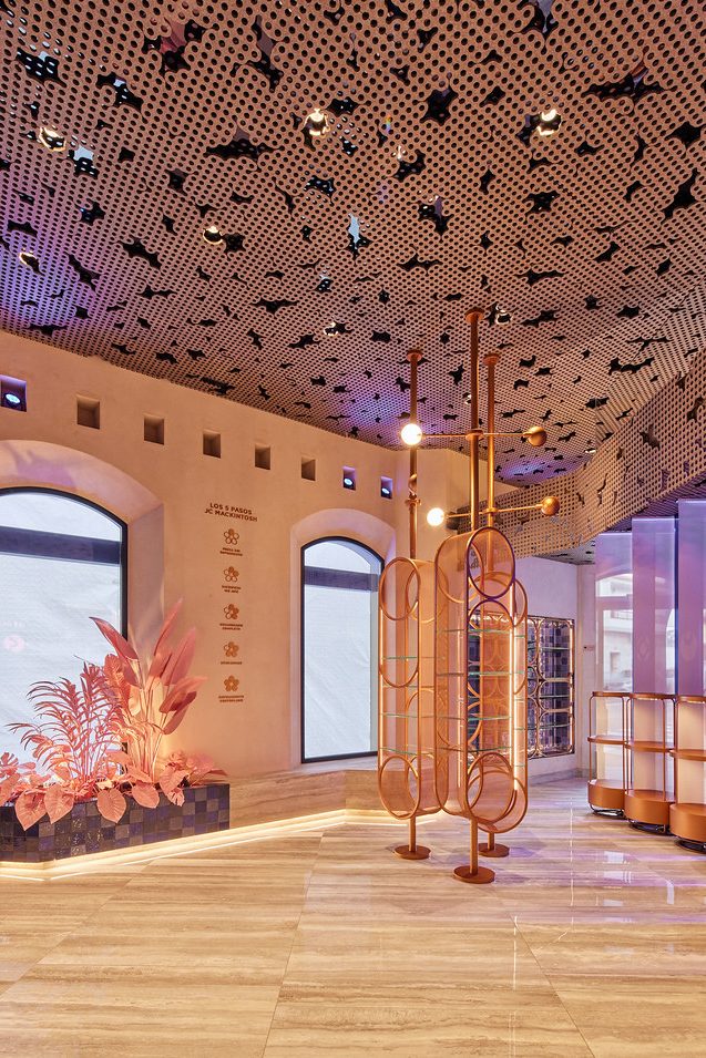 El interior de la tienda ha sido diseñado por el Estudio EEBA, que ha creado un espacio inspirado en el paisaje natural de Tarifa. El diseño utiliza materiales sostenibles como mortero de cal, azulejo artesanal y revestimientos realizados con PET reciclado procedente de botellas. Estos elementos evocan las formaciones rocosas Flysch presentes en la costa tarifeña y combinan tradición y modernidad.